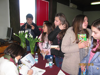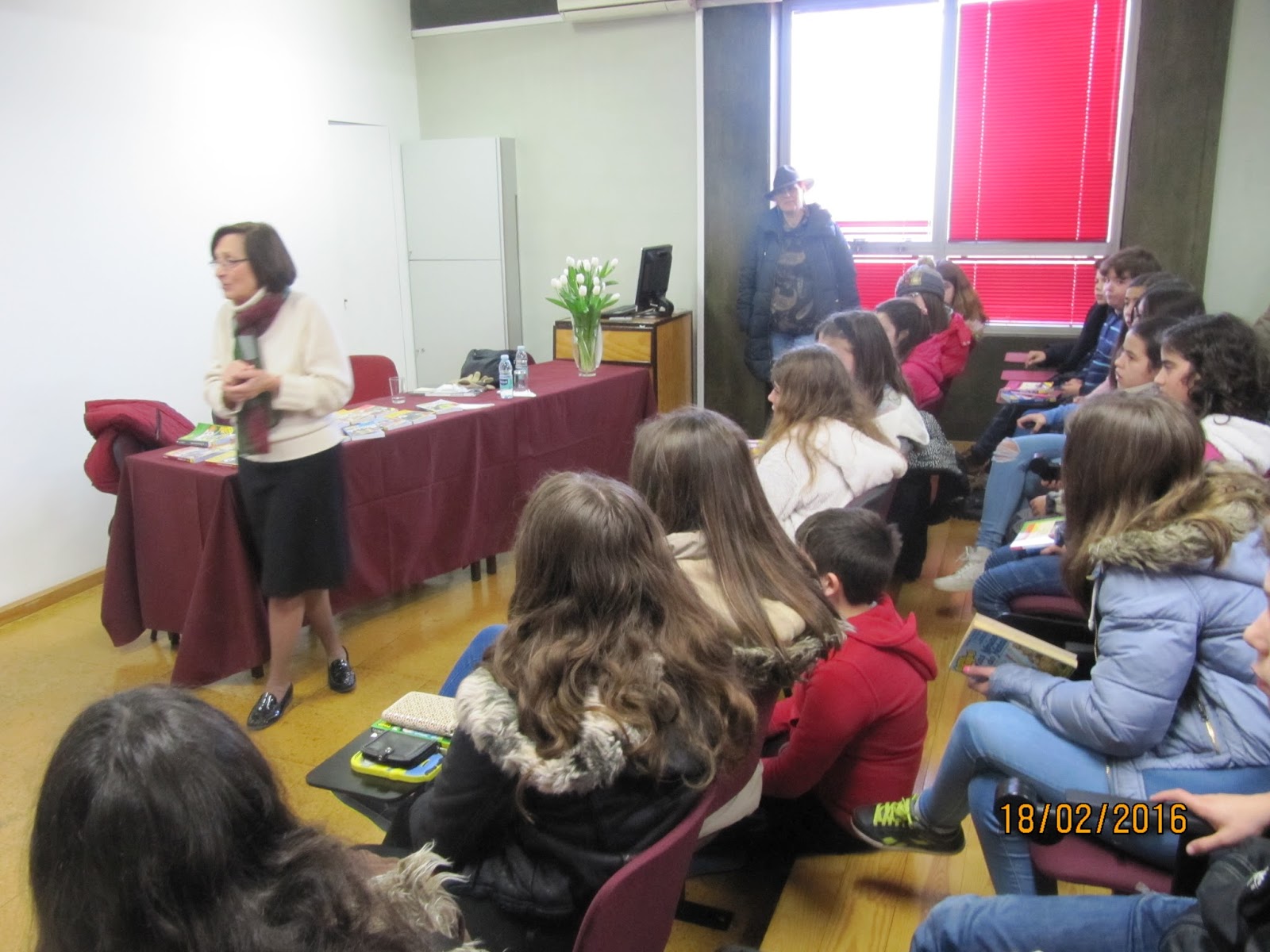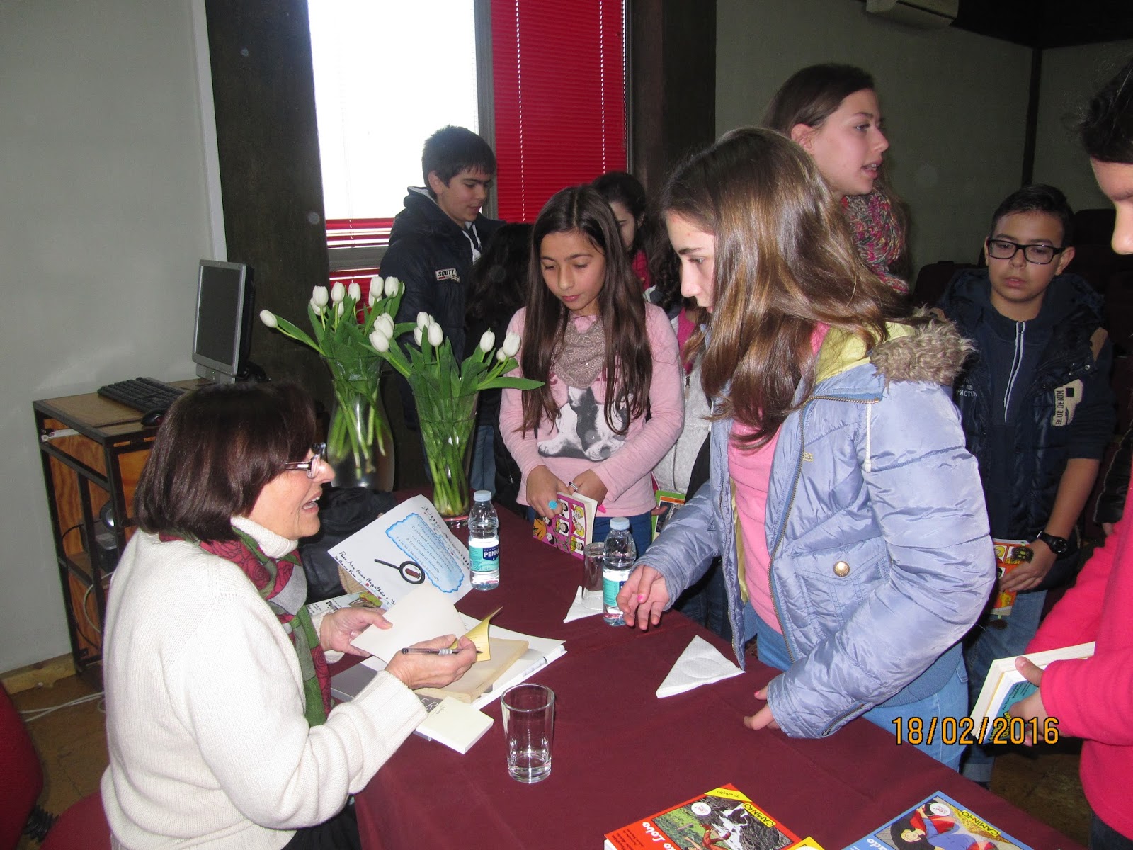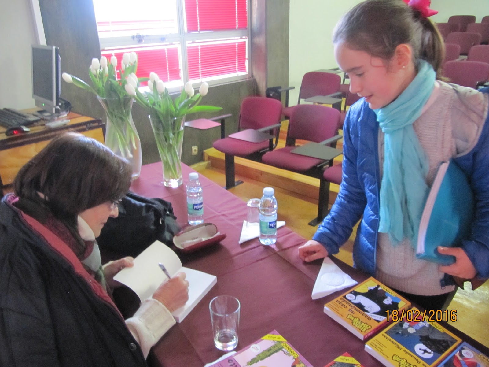A escritora terminou a sua visita ao nosso agrupamento na Escola de Finzes. Aqui tiveram lugar três sessões, às quais assistiram também os alunos de Bairros. A professora bibliotecária e a professora titular de uma das turmas do 3º ano prepararam uma pequena peça de teatro, com a qual abriram as sessões. Os alunos tinham preparadas muitas perguntas, às quais a escritora respondeu, satisfazendo assim a curiosidade dos alunos e motivando-os a ler mais as suas obras. No final de cada sessão houve uma concorrida sessão de autógrafos.