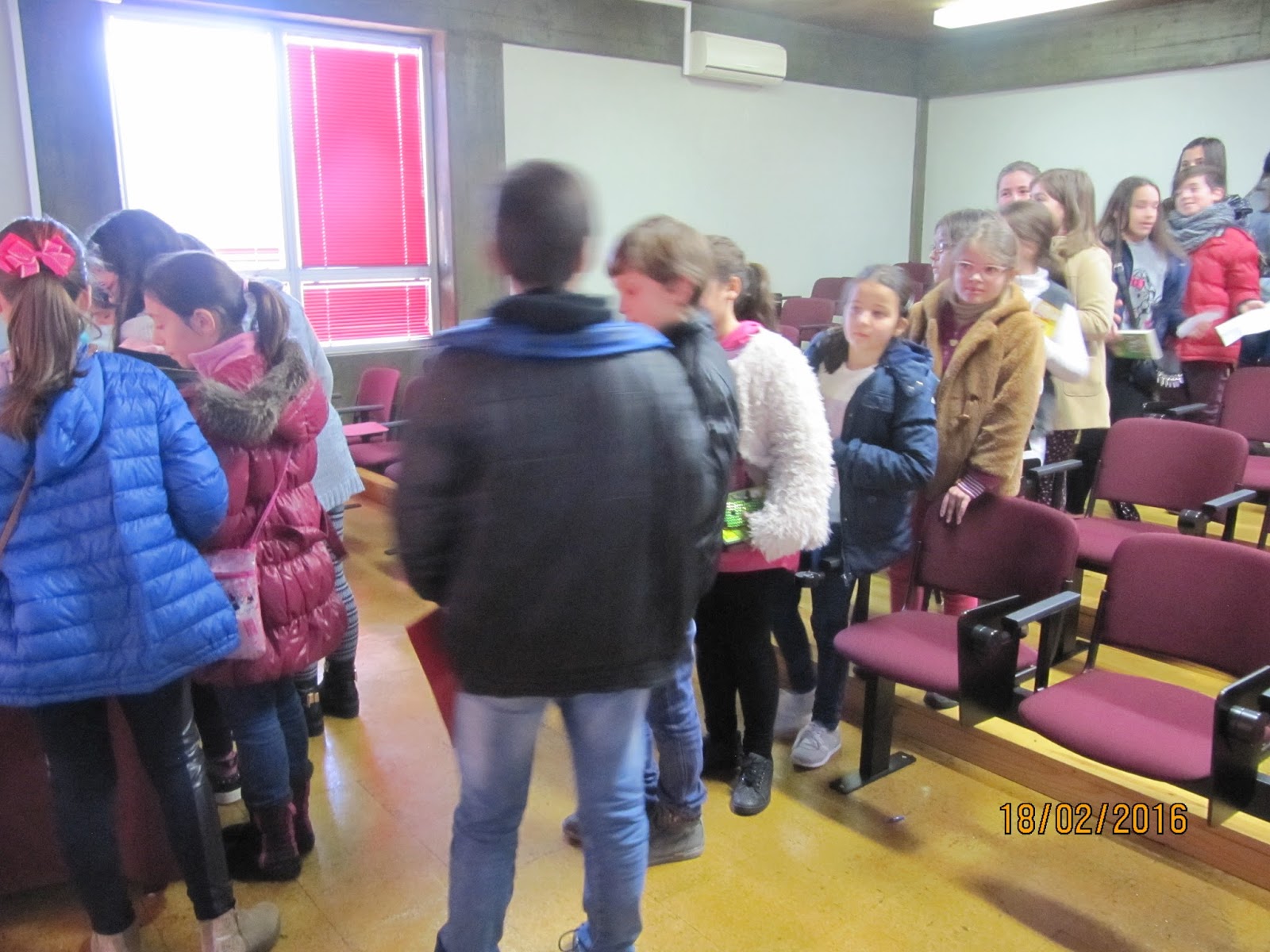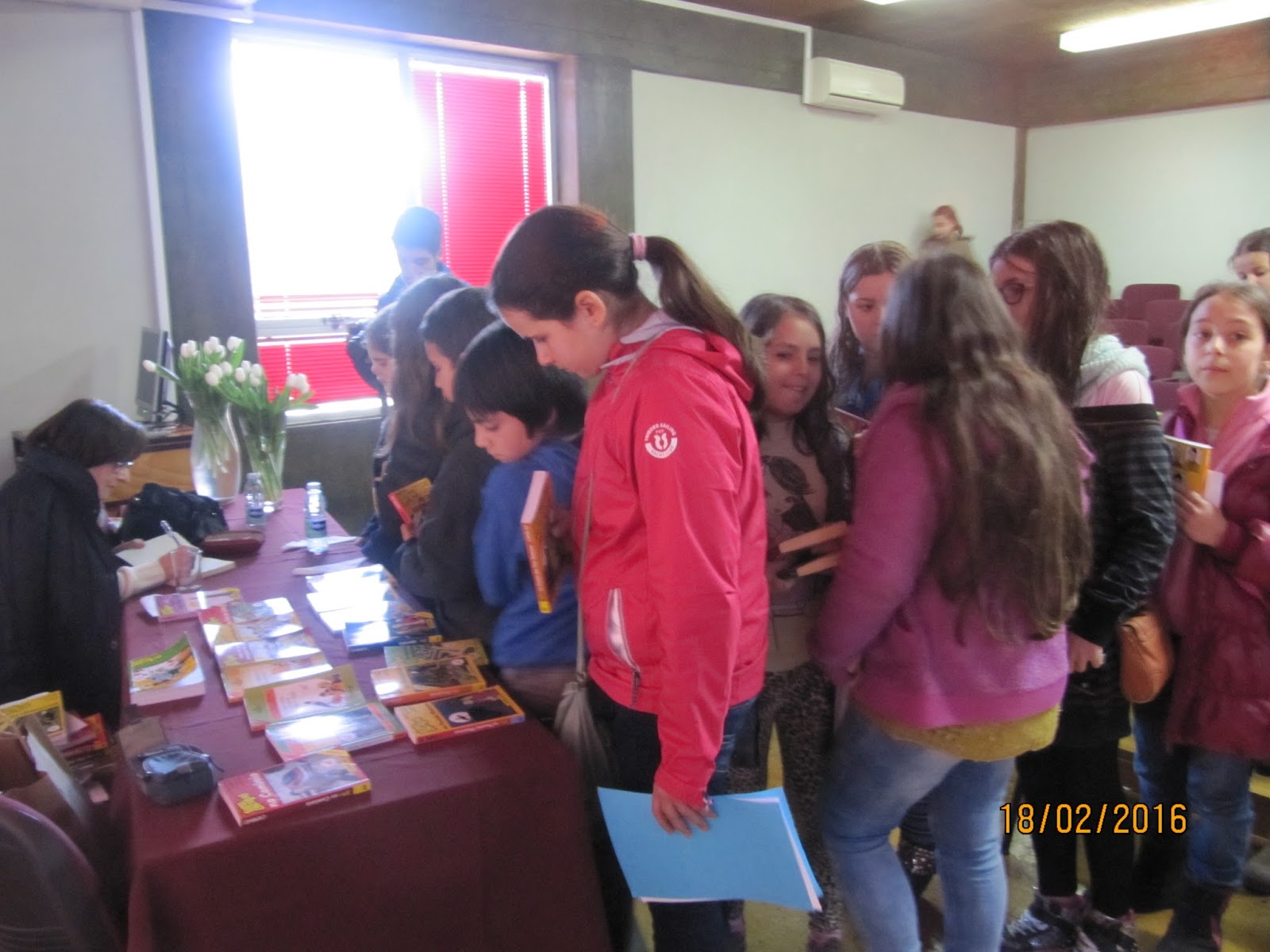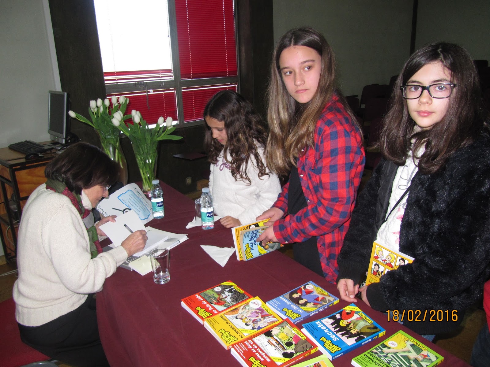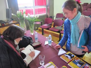 A escritora terminou a sua visita ao nosso agrupamento na Escola de Finzes. Aqui tiveram lugar três sessões, às quais assistiram também os alunos de Bairros. A professora bibliotecária e a professora titular de uma das turmas do 3º ano prepararam uma pequena peça de teatro, com a qual abriram as sessões. Os alunos tinham preparadas muitas perguntas, às quais a escritora respondeu, satisfazendo assim a curiosidade dos alunos e motivando-os a ler mais as suas obras. No final de cada sessão houve uma concorrida sessão de autógrafos.